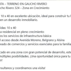 Vta. Lote. ¡Excelente oportunidad! s/ Gaucho Rivero casi Avenida Moreno